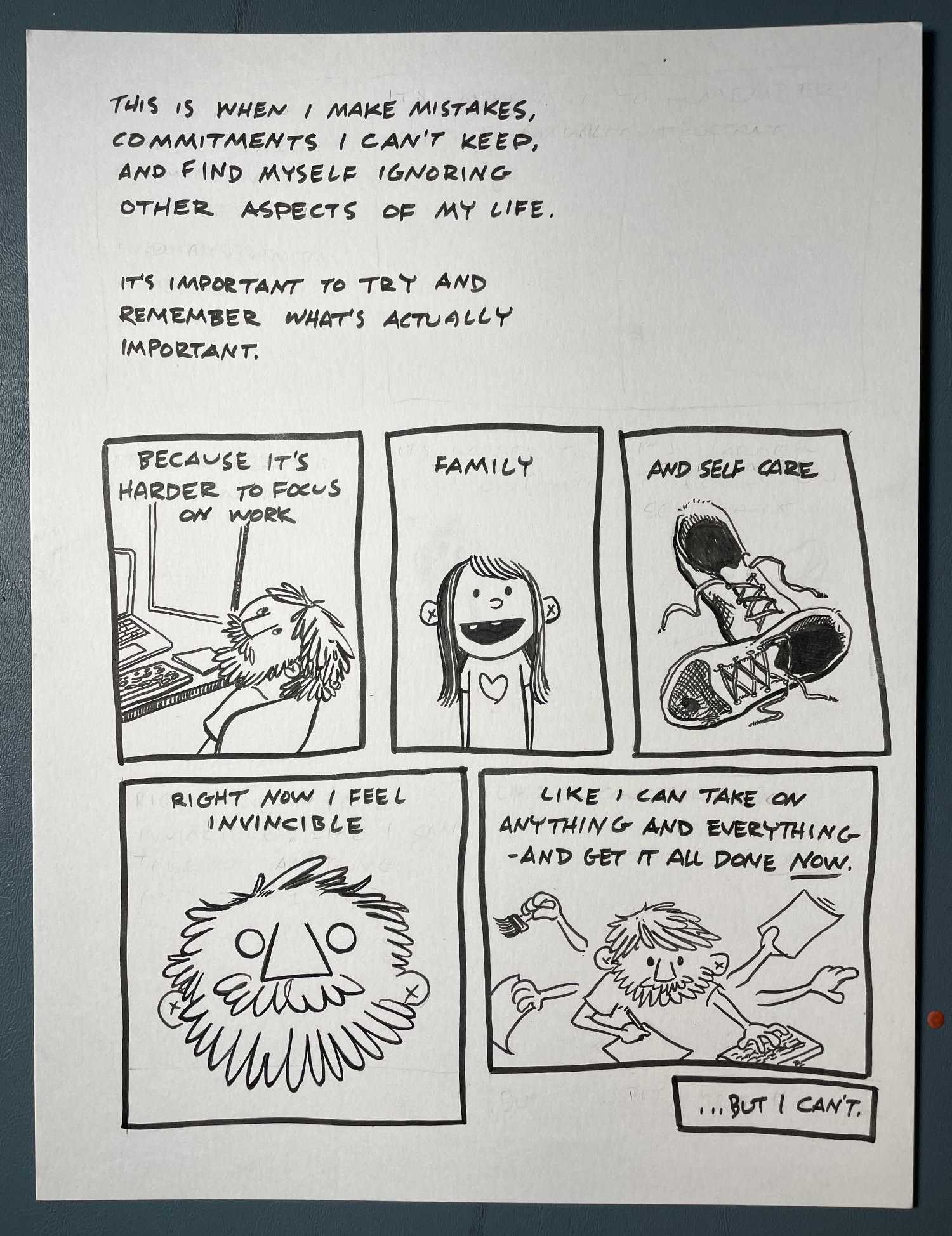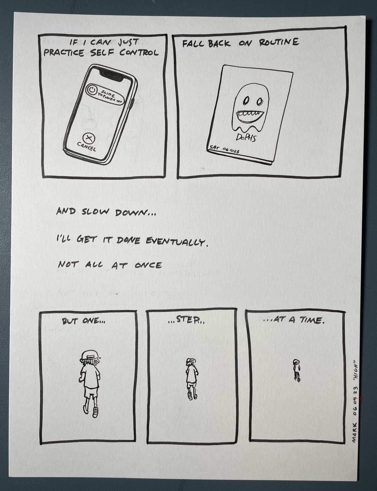 Self control, routine, and pacing seem to keep me from riding too high or low. A steady state of patient creation yields more and better results in the long run than infrequent flurries of manic activity.